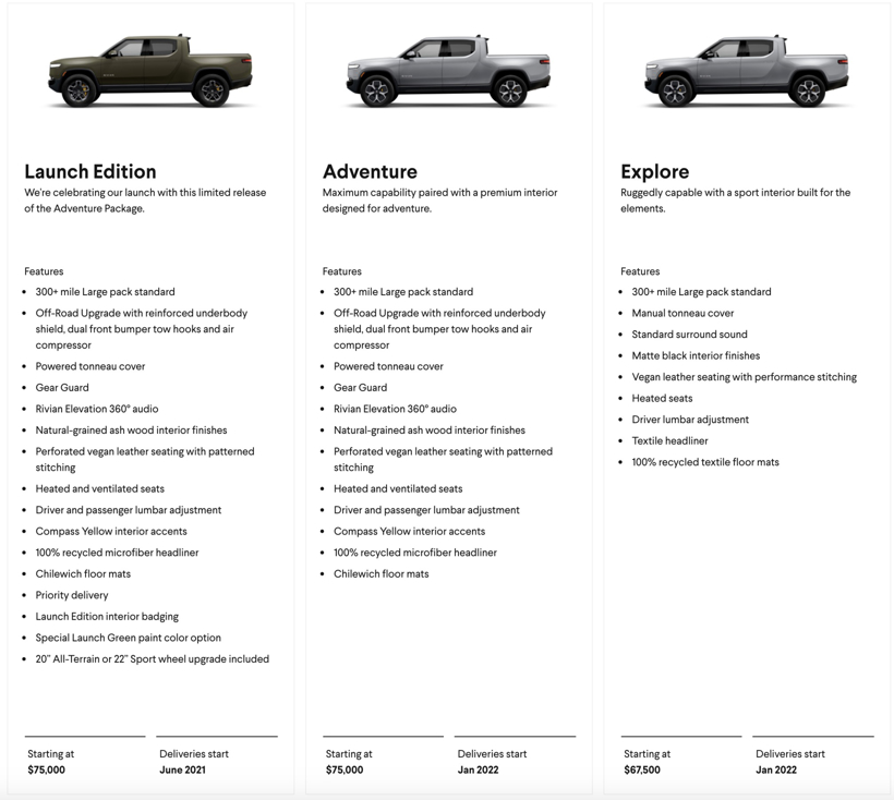 R1T Launch、Adventure、 Explore具体信息(图片来源:Rivian)
